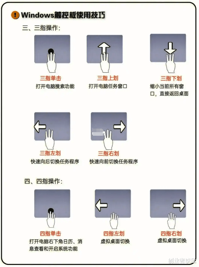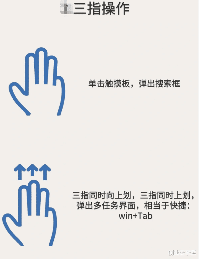 3、三个手指头(切换任务神器):上滑 = 看所有打开的窗口(像翻牌子)。下滑 = 瞬间最小化所有窗口(桌面干干净净)。左右滑 = 快速切换正在用的软件(跟 Alt+Tab 效果一样)。
